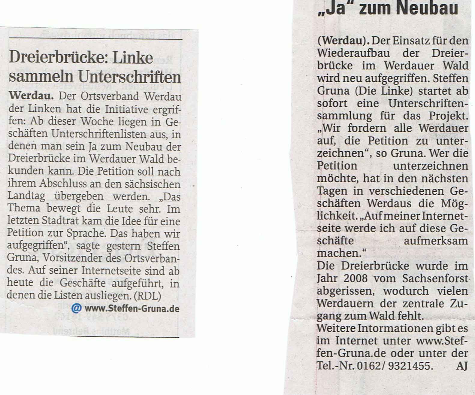 Petition verfehlt ihr Ziel Statt Dreierbrücke wenigstens Übergang über die Gleise WERDAU - Die Hoffnung, dass die Dreierbrücke im Werdauer Wald wieder aufgebaut wird, hat sich für Steffen Gruna, Vorsitzender des Ortsverbandes Werdau Die Linke, zerschlagen. „Unsere Petition hat ihr Ziel nicht erreicht Mit dem 'Argument der wirtschaftlichen Verwendung von Haushaltsmitteln wird eben alles infrage gestellt, was den Bürgern wichtig ist", so sein Fazit. Allerdings hätten die mehr als 2000 Unterzeichner der Petition erreicht, dass sich die Staatsregierdng in Zukunft mit dem Thema beschäftigen muss. Auch wenn es nur ein so ge- nannter niveaugleicher Ubergang über die Bahnschienen wird, wäre den Erholungssuchenden im Wer- dauer Wald geholfen. Wie Bernd Härtel vom Staatsbetrieb Sachsenforst sagte, hätte sich der Besitzer der Bahnstrecke, die Deutsche Regionaleisenbahn (DkE) vor einigen Tagen nach monatelangem Stillschweigen gemeldet. Mit zwischen 3 8.000 bis 40.000 Euro veranschlagt die DRE die Kosten für einen Übergang. Eine so genannte Kreuzungsvereinbarung muss der Freistaat ausstellen. Man bleibe dran, so Härtel. (RDL)