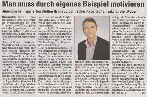 (Werdau). Am 20. Februar wählte der Ortsverband der LINKEN auf ihrer Gesamtmitgliederversammlung in der Stadthalle Pleißental seinen neuenVorstand. Steffen Gruna wird auch die nächsten zwei Jahre dem Ortsverband Werdau vorstehen. Er wurde einstimmig von allen anwesenden Mitgliedern wiedergewählt. Während der Versammlung wurde darüber .diskutiert, welche Aufgaben auf den neuen Ortsvorstand in den nächsten zwei Jahren, zukommen, denn die letzten beiden Jahre waren sehr von Wahlkämpfen geprägt. Jetzt wird sich auf die inhaltliche Arbeit konzentriert, begonnen habe man bereits mit dem Sammeln von Unterschriften für die Petition zum Wiederaufbau, der Dreierbrücke im Werdauer Wald, so Gruna. Als weitere Mitglieder des Ortsvorstandes wurden gewählt: Jürgen Erler, Wilfried Schaarschmidt, Manfred Benedict, Peter Mögling, Thomas Karl, Axel Clemens,' Dr.Wilfried Bartsch, Robby Scharmacher und MdB Sabine Zimmermann. Zum Ortsverband Werdau gehören neben der Stadt Werdau die Gemeinden Langenbernsdorf, Fraureuth und Lichtentanne. WS/UP
