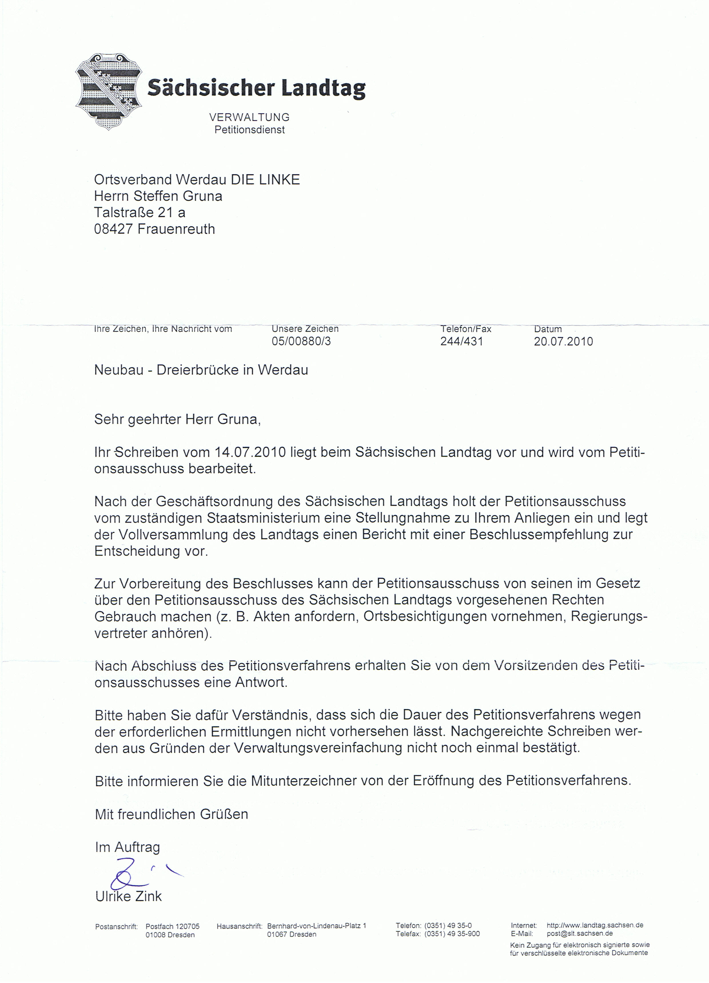 Antwort vom Petitionsausschuss des Sächsischen Landtages vom 11.11.10